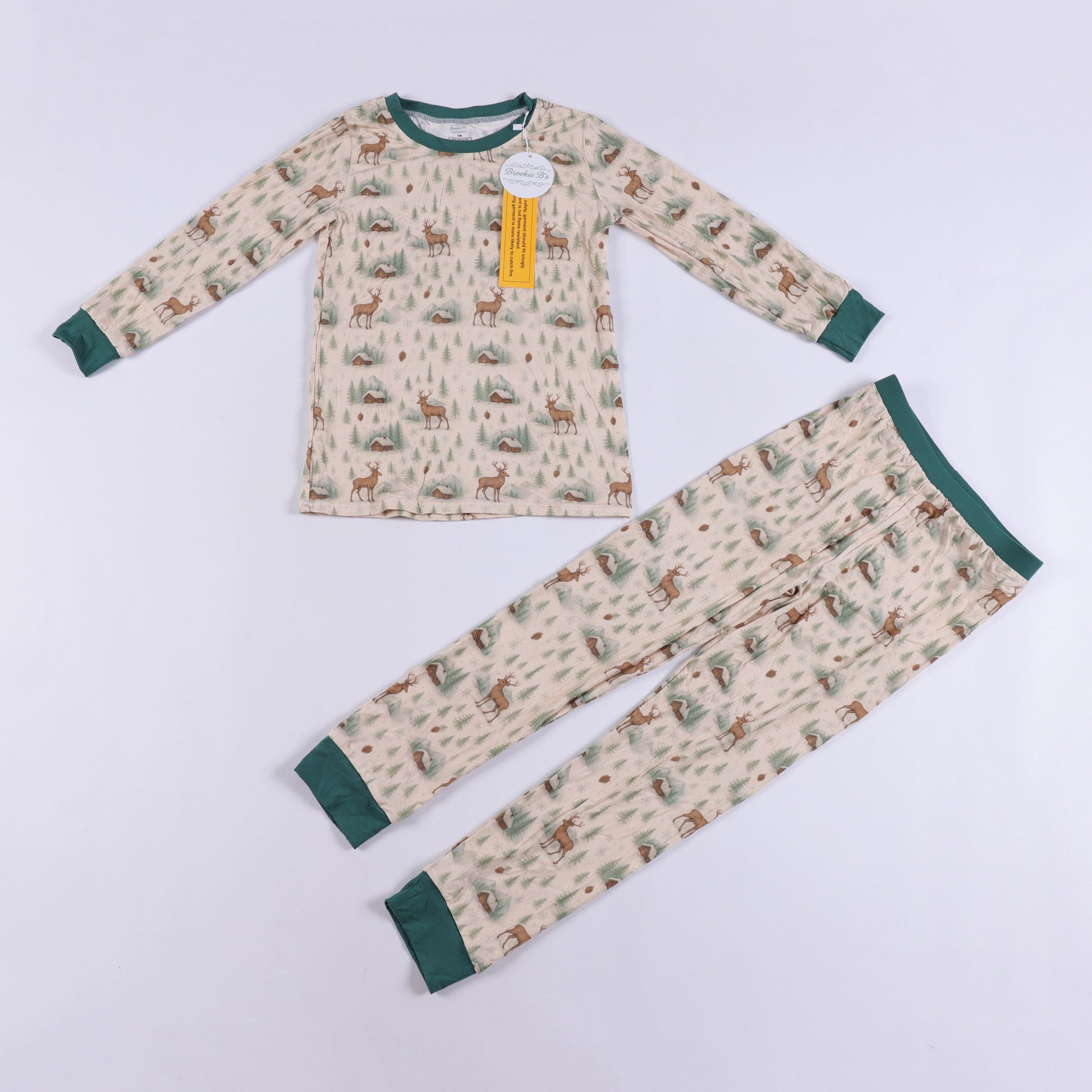 Where cozy comfort meets rustic charm. Our Whispering Pines bamboo two-piece pajama set is inspired by peaceful forest mornings and nights under the stairs. Featuring soft earthy tones, gentle deer silhouettes, and Brookie B's signature buttery bamboo fabric - this set is made for snuggles, storytime and sweet dream.